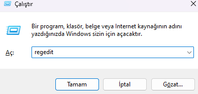 - Açılan bu pencereye “regedit” yazalım ve tamam butonuna basalım.