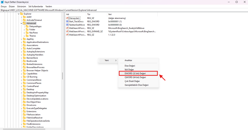 - Bu yolu takip edip pencereyi açtıysanız aşağıda eklemiş olduğumuz görselde ki gibi boşluğa sağ tıklayıp Yeni > DWORD 32-Bit seçeneğini seçiyoruz.