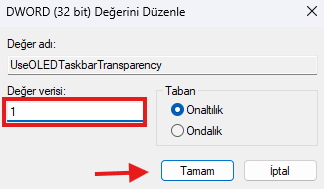- Oluşturmuş olduğunuz DWORD dosyasının adını “UseOLEDTaskbarTransparency” olarak değiştirin ve üzerine çift tıklayın ve değer vermek için pencerenin açılmasını bekleyin.